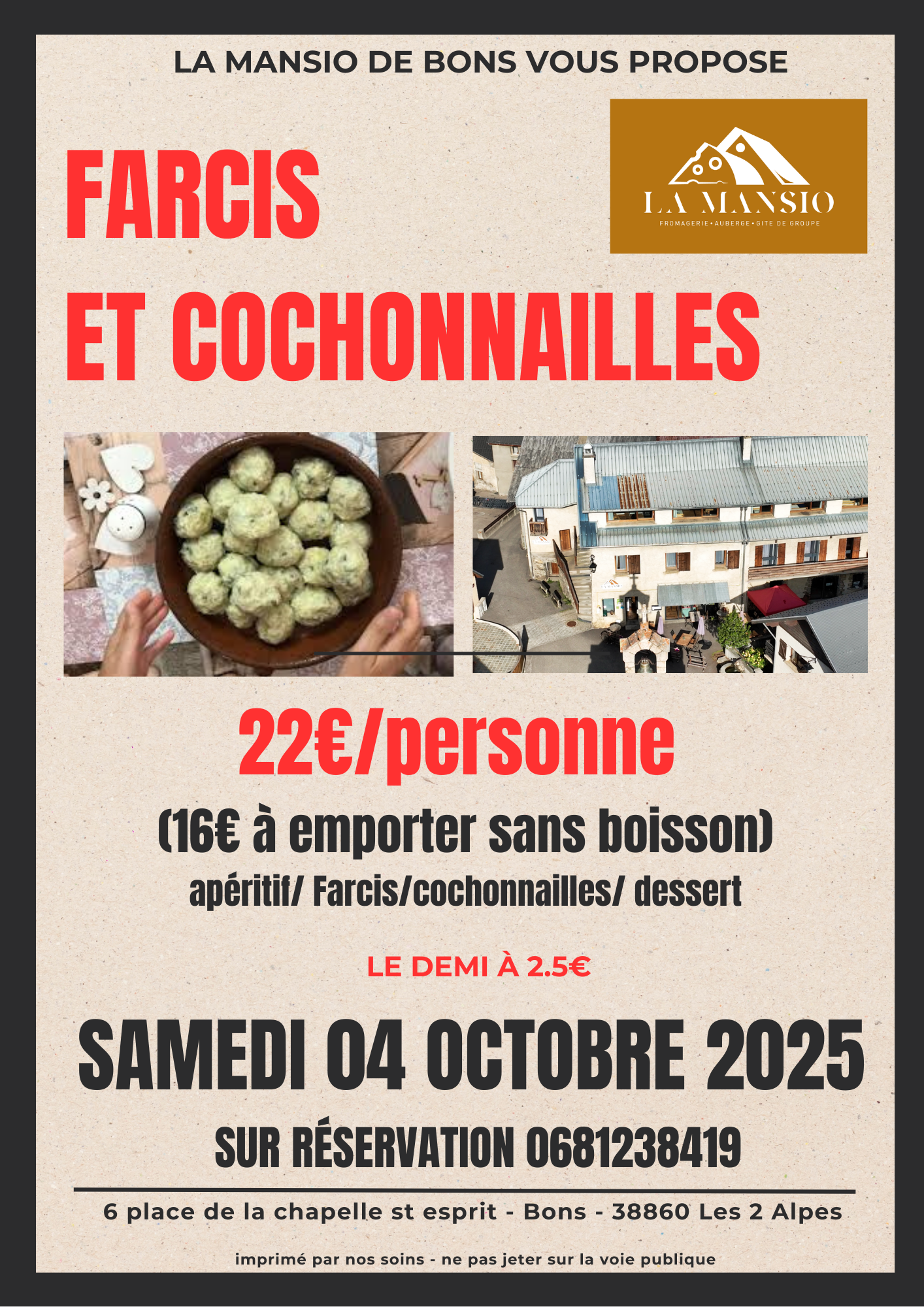 Réservez dès maintenant votre place pour cette fête gourmande du terroir montagnard. Offrez-vous une soirée où gastronomie, partage et authenticité se rencontrent, uniquement à La Mansio de Bons.